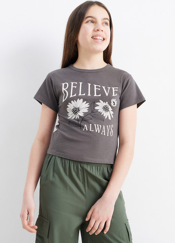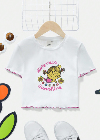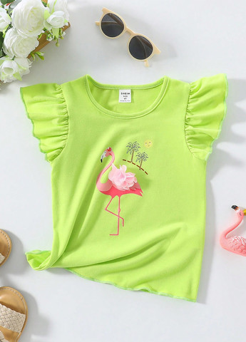 Милая футболка для девочек с цветочным принтом и фламинго. Верх украшен рюшами, круглым вырезом и короткими рукавами с оборками. Он изготовлен из ткани средней эластичности, имеет стандартную посадку, длину и тип рукава.
