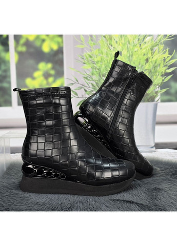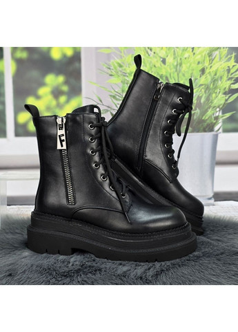 Женские демисезонные ботинки Fabio Monelli выполнены из черной эко-кожи. Модель имеет массивную платформу высотой 4–5,5 см из ПВХ и голенище высотой около 15,5–16,5 см. Внутри использован флис для подкладки и стельки.