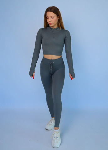Спортивный комплект в сдержанном сером оттенке выполнен из плотной эластичной ткани с фактурой "в рубчик".
