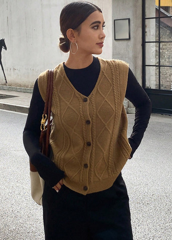Женский вязаный жилет DAZY с косами. Этот жилет имеет V-образный вырез. Подходит для повседневной носки. Застежка на пуговицы спереди. Простой крой и фасон. Жилет коричневого цвета, стандартной длины. Предназначен для весенне-осеннего периода. Свободный крой и лёгкая растяжимость. Жилет изготовлен из трикотажной смеси. Рекомендуется машинная стирка или профессиональная химчистка.