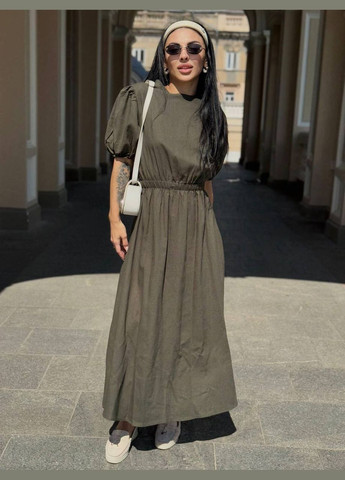 Рукава – короткие и слегка объемные, в стиле "фонарик", что создает стильный акцент в верхней части. Длина меди придает образу сдержанной элегантности, а тонкая талия и плавные линии подчеркивают фигуру.