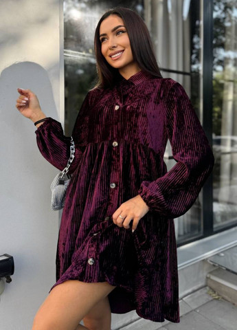 Мини платье свободного кроя. Платье с длинными рукавами фонарик. Воротник – стойка. Застёгивается на пуговицы. Ткань: велюр гофре.