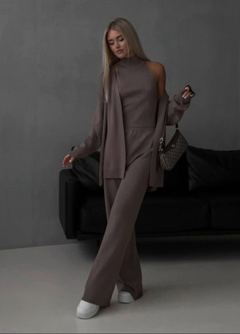 Топ имеет короткую длину и свободную посадку, что позволяет носить его самостоятельно или под кардиган. Брюки прямые, с эластичным поясом, обеспечивают свободу движений и комфорт. Кардиган длинный с длинным рукавом, дополняющий комплект и создающий завершенный стильный образ.