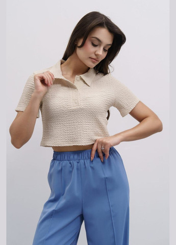 Укороченная футболка-поло из мягкой фактурной ткани в базовом бежевом цвете – стильная и универсальная модель, которая сочетает в себе комфорт и современный дизайн. Благодаря полуприлегающему силуэту она удачно подчеркивает фигуру, не ущемляя движений, а укороченная длина придает образу легкости и свежести.
