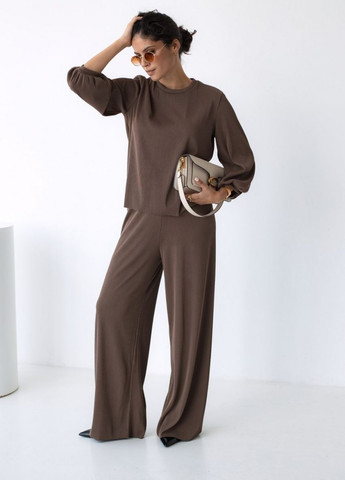 Женский кэжуал костюм из микро-велюра, идеальный для позднего лета. Кофта с застежкой на пуговицы спереди дополнена накладными карманами с нашивкой по бокам, добавляя функциональности. Брюки с высокой посадкой и прямым кроем с карманами создают завершенный образ, подчеркивая легкость и практичность костюма.
