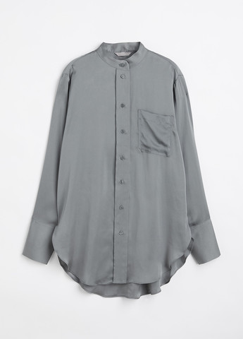Рубашка оверсайз из плетеной ткани с блеском. Воротник дедушка, пуговицы спереди, открытый нагрудный карман и двухслойная кокетка сзади. Мягко спущенные плечи, длинные рукава с широкими манжетами на пуговицах и скругленный низ. Сзади чуть длиннее. Без подкладки. Рукав: длина: 62,4 см (размер M), спинка: длина: 83,4 см (размер M). Возможно, повреждена бирка.
