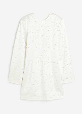 Короткое платье из мягко драпированного атласа, украшенное перламутровыми пластиковыми бусинами. Круглый вырез горловины спереди, глубокий V-образный вырез сзади, формирующие вытачки на талии и скрытая молния сзади на крючке. Плечевые накладки, плавно спущенные плечи и удлиненные рукава с разрезами на манжетах. На подкладке.