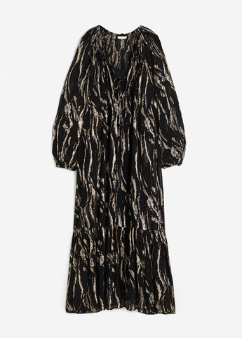 Платье оверсайз к лодыжке из вискозной ткани с мерцающим рисунком. V-образный вырез с узкими завязками. Длинные объемные рукава баллон с узкой резинкой на конце. У него узкая талия на шнурках и слегка расклешенная юбка с воланом для дополнительного объема.
