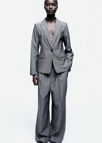 Однобортный блейзер оверсайз из тканой ткани. Лацканы с вырезами, застежка на пуговицы спереди и украшенные передние карманы с клапаном. Спущенные плечи и длинные рукава с декоративными пуговицами на манжетах. Одна шлица сзади. На подкладке. Плечи: ширина: 48,7 см (размер M), спинка: длина: 75,9 см (размер M), рукав: длина: 60,4 см (размер M).