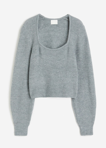 Короткий свитер в рубчик с глубоким квадратным вырезом и длинными широкими рукавами с прилегающими манжетами в рубчик.