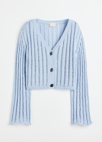 Короткий кардиган из мягкой трикотажной ткани. Круглый вырез, пуговицы спереди, мягко спущенные плечи, длинные рукава. Резинка на горловине, планке на пуговицах, манжетах и подоле.