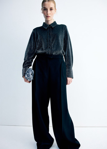 Блузка из эластичного трикотажа с блестящей пряжей. Имеет воротник, планку на пуговицах и кокетку сзади со складкой. Длинные рукава с манжетами на пуговицах и скругленным подолом. Спинка: длина: 69,0 см (размер M), Рукав: длина: 60,0 см (размер M), Плечи: ширина: 41,5 см (размер M).