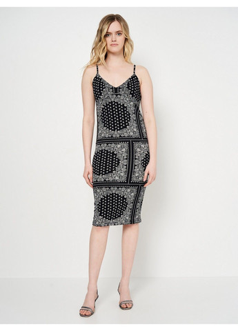 Облегающее платье до колен из эластичного плетения с узкими регулируемыми бретелями и швом под грудью. Зигзагообразные швы спереди и сзади, а также разрез и скрытая молния сзади. Трикотажная подкладка. Возможно повреждение бирки