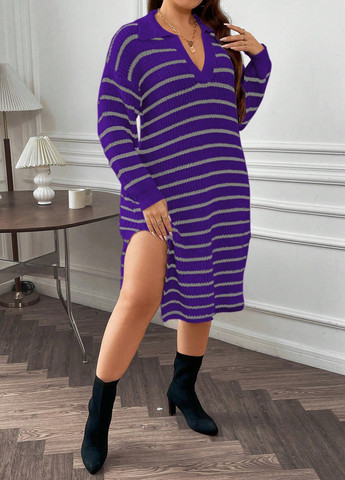 Женское платье-свитер Plus Size Striped Split Hem. Это платье свободного кроя с разрезом по низу. У него спущенные плечевые рукава и прямой разрез по низу. Ткань средней эластичности. Вырез горловины — воротник, а линия талии естественная.