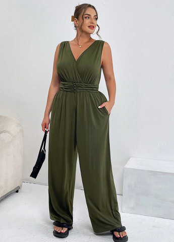 Этот комбинезон больших размеров выполнен из полупрозрачной ткани с V-образным вырезом и имеет свободный крой. Он имеет широкие брюки и застежку-молнию.