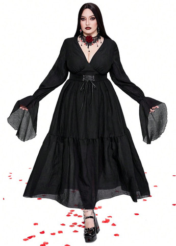 Платье Flirla Goth Plus Size – чёрное. Длинное чёрное платье с глубоким V-образным вырезом и расклешёнными рукавами. Высокая талия и А-силуэт. Платье изготовлено из 100% полиэстера. Не тянется. Инструкция по уходу: машинная стирка или профессиональная химчистка.