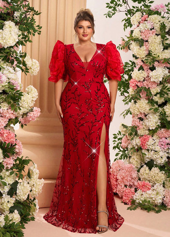Элегантное макси-платье Glamrae Plus – красное. Это макси-платье с глубоким V-образным вырезом и высоким разрезом. Платье имеет короткие рукава и приталенный крой. Платье выполнено из полиэстеровой ткани. Платье украшено пайетками и застегивается на молнию. Подходит для торжественных случаев.
