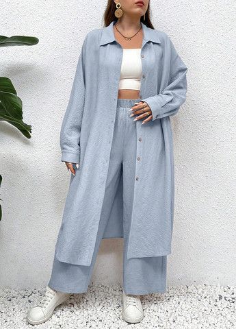 Franclia 2-Piece Set: рубашка с длинным рукавом и брюки. Этот комплект отличается свободным кроем с воротником рубашки и рукавами Bishop. Особенности включают застежку на пуговицы спереди и карманы. Ткань не тянется.