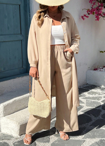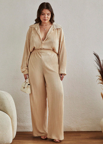 Костюм SHEIN Essnce Plus Size Lion Mountain. Этот комплект из двух частей состоит из блузки с круглым вырезом и брюк широкого кроя. Костюм не тянется и рассчитан на свободную посадку. Включает карманы и рукава-бишоп.