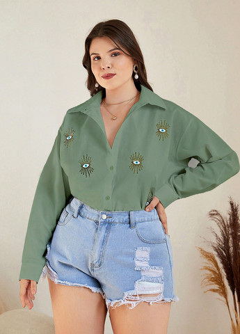 Рубашка с принтом глаз Drop Shoulder. Эта рубашка обычного кроя имеет рукав с приспущенным плечом и отложной воротник. Она изготовлена из неэластичной хлопковой ткани и имеет стандартную форму подола. Она включает застежки на пуговицы.