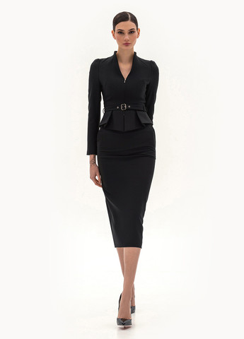 Вид изделия: брючный комплект, состоящий из двубортного, удлиненного жилета, с воротником и лацканами, с боковыми разрезами, ассиметричными деталями на поясах-завязках с пряжкой и свободных, широких брюк со складами. Силуэт, длина: свободный, макси. Посадка по линии талии: классическая. Плотность и вид ткани: средней плотности текстильный материал с добавлением эластана. Вид застежки: отлетные пояса на пряжке в жилете, молния и крючки в брюках. Наличие подкладочной ткани: присутствует в жилете. Наличие и вид карманов: карманы в рамку с клапаном в жилете, подкройные карманы в брюках. Вырез горловины: V-образный. Вид рукава: без рукава.