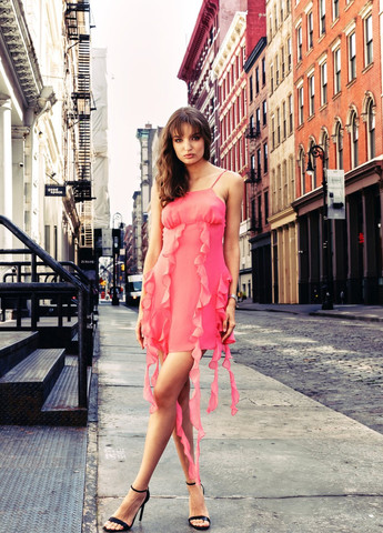 Шифоновое мини платье с подчеркнутым лифом и рюшами по длине. Модель на тонких бретелях, длину которых можно регулировать. Застёгивается на скрытую молнию сзади. Не просвечивается, на подкладке.