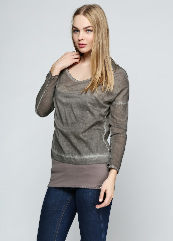 свободная нетрикотажная блуза с длинным рукавом, спущенной линией плеча, овальным вырезом горловины и удлиненной спинкой. Трикотажная майка на тонких регулируемых бретелях, снизу декорирована мелкими прозрачными пайетками