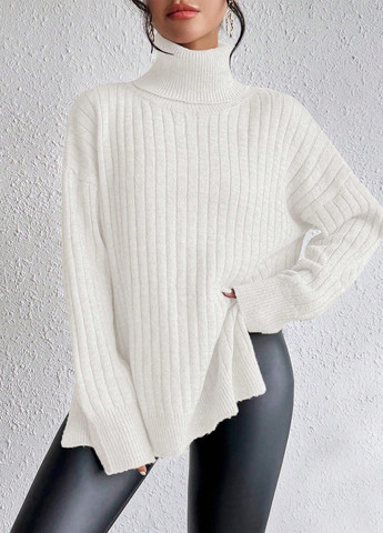 Зимний бежевый свитер повседневного большого дизайна с высоким вырезом и длинными рукавами. Стиль со спущенными плечами придает расслабленности, а разделенное деление придает современный вид. Изготовленный из ткани средней эластичности, этот свитер идеально подходит для повседневной носки в холодную погоду.