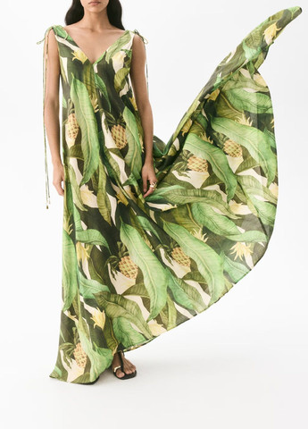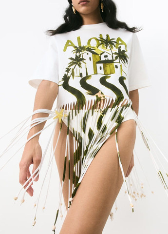 Футболка из плотного хлопкового трикотажа с принтом с мотивом спереди. Ребристый круглый вырез горловины, спущенные плечи и рукава к локтям. Свободный крой. Длинная, волнистая бахрома с декоративными бусинами на концах тянется от талии к подолу.