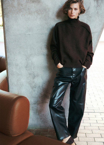 Брюки из ткани с покрытием, с видимой молнией и скрытой пуговицей с одной стороны. Прямые штанины.
