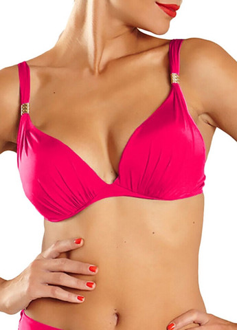 Купальный лиф с уплотненной формой чашечек с эффектом push-up, на косточках, со съемными подушечками. Слегка присобранный по нижнему краю. Застежка сзади на металлическую пряжку, съемные регулируемые бретели с металлическим декором.