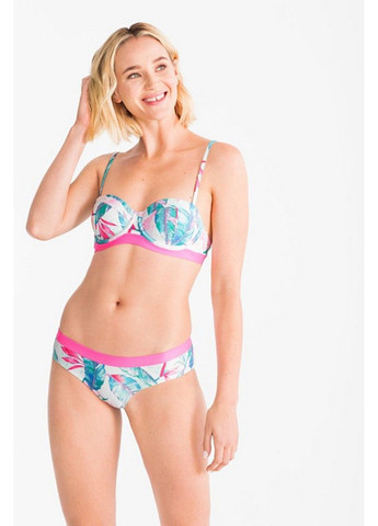 Купальный бюстна подкладке. Чашечки без косточек, уплотненные, с вынимающимися вкладками, придают бюсту форму и хорошо поддерживают его. Широкие регулируемые бретели. Застежка на металлическую пряжку сзади.