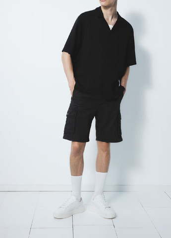 Рубашка с короткими рукавами из жатой вискозной смеси, с воротником-лацканами, французской застежкой на пуговицы и кокеткой сзади. Прямой подол с разрезами по бокам. Свободный крой, свободный, но не слишком объемный силуэт.