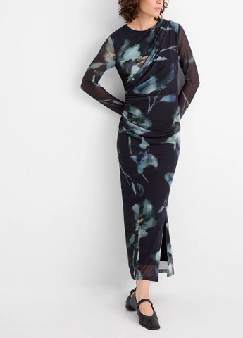 Платье-сетка из мягкой ткани с цветочным узором и полупрозрачными частями. Боковые складки, застежка на пуговицах на спине и гладкая трикотажная комбинация. Длина по спинке примерно 134 см, длина рукава примерно 62 см, талия примерно 80 см в размере L; длина по спинке примерно 133 см, длина рукава примерно 59 см, талия примерно 64 см в размере S.