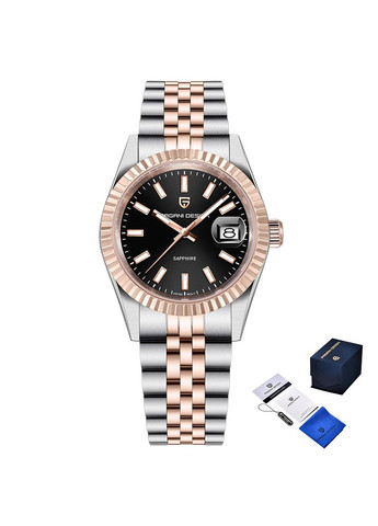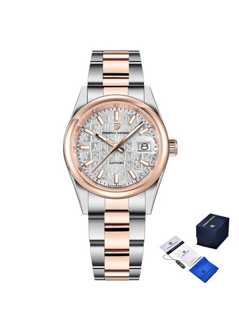 Часы Pagani Design PD-1794L Silver-Rose Gold-White Стильные и элегантные часы Pagani Design PD-1794L сочетают в себе классический дизайн и современные материалы. С диаметром корпуса 35 мм и весом всего 70 г, эти женские часы отлично подойдут для ежедневного использования. Корпус и ремешок изготовлены из качественной стали, что обеспечивает долговечность и утонченность. Водонепроницаемость до 50 м позволяет не беспокоиться о каплях воды, а сапфировое стекло защищает циферблат от царапин. Механический механизм с автоподзаводом гарантирует точность в измерении времени, а люминесцентная индикация на циферблате позволяет удобно читать время в темноте. Часы имеют круглую форму корпуса и стрелочный циферблат с индексами, что подчеркивает его классический стиль. Он станет отличным дополнением к любому образу, будь то повседневный или торжественный. Бренд Pagani Design гарантирует высокое качество продукции, а 12-месячная гарантия придает дополнительную уверенность в вашем выборе. Выберите Pagani Design PD-1794L – и наслаждайтесь элегантностью и функциональностью в каждой детали!