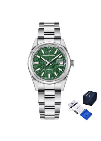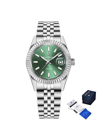 Описание часов Pagani Design PD-1794M Silver-Green: Созданные для стильных и современных мужчин, часы Pagani Design PD-1794M сочетают элегантность и функциональность. Корпус из высококачественной стали диаметром 39 мм в серебристом цвете надежно ограждает механический механизм с автоподзаводом. Сапфировое стекло обеспечивает высокую стойкость к царапинам и сохраняет идеальный вид на долгое время. Эти часы имеют водонепроницаемость до 50 метров, что делает их отличным выбором для активного образа жизни. Стильный циферблат со стрелками и индексами отображает часы, минуты и секунды, а также люминесцентную индикацию для легкого чтения в темноте. Благодаря удобному браслету из металла, эти часы идеально подойдут для повседневного использования, а современный casual и классический стиль позволяют сочетать их почти с любым нарядом. Приобрести эти часы – значит выбрать надежность, стиль и качество. Страна производителя – Китай; на часы предоставляется гарантия 12 месяцев.