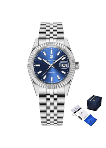 Часы Pagani Design PD-1794M Silver-Blue Описание: Встречайте Pagani Design PD-1794M — стильные мужские часы, которые отличаются сочетанием элегантности и функциональности. Эти часы изготовлены из специальной нержавеющей стали, которая обеспечивает надежность и долговечность. Его серебристый корпус диаметром 39 мм и механический механизм с автоподзаводом гарантируют точность и удобство в использовании. Сапфировое стекло надежно защищает стрелочный циферблат с индексами, обеспечивая ясность и удобство чтения времени. Часы имеют водонепроницаемость до 50 м, что делает его идеальным спутником для активных мужчин. Модель отражает стиль casual и классики, а крепкий стальной браслет не только дополняет элегантный внешний вид, но и обеспечивает комфорт при ношении. С дополнительными функциями, такими как люминесцентная индикация, эти часы станут отличным выбором для любого случая. Pagani Design PD-1794M – это не только аксессуар, но и проявление вашего стиля. Гарантия на 12 месяцев подтверждает качество и надежность этих часов.