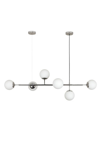 Материал люстры: металл Цвет люстры: хром Цвет плафона: белый Диаметр плафона: 130 мм Материал плафона: стекло Количество плафонов – 6 Высота люстры – регулируется Длина люстры – 1150 мм Размер креплений к потолку – 100 мм (2 шт.) ламп Е27 Максимальная мощность лампочки 60 Ватт Возможность использования лампы: LED, накаливание, энергосберегающая Комплектация лампочками: нет Тип люстры – подвесная