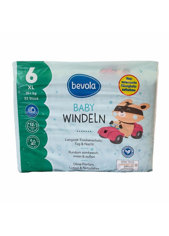 Подгузники Bevola - это защита от протеканий даже при интенсивных движениях ребенка. - хранят в сухом состоянии кожу ребенка до 12 часов; - позволяют коже дышать; поглощение; - дерматологические проверенные; - призваны снизить риск возникновения аллергической реакции; - полномерные; - красочный дизайн.