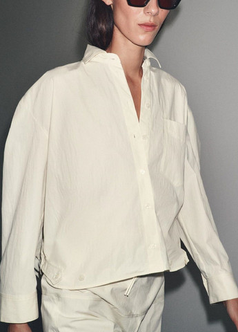 Рубашка из хлопкового поплина с отложным воротником, классической планкой на пуговицах, кокеткой на спине с плиссировкой и открытым нагрудным карманом. Длинные рукава с регулируемыми манжетами на пуговицах и пуговицей на разрезе рукава. Слегка закруглённый низ. Свободный крой, свободный, но не слишком объёмный силуэт.