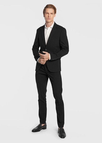 Спортивный костюм, состоящий из черной кофты на молнии и черных спортивных штанов. Кофта имеет высокий воротник, белые молнии и шнурки, а также серые вставки по бокам и рукавам. На груди расположен светлый логотип. Брюки прямого кроя, с белой полосой по боковому шву