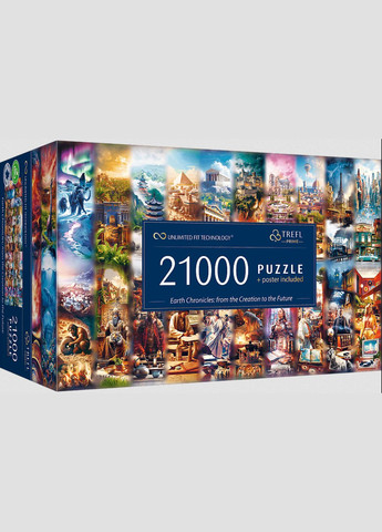 Откройте для себя пазл Trefl Prime UFT - Хроники Земли: от сотворения мира до будущего, состоящий из впечатляющих 21 000 деталей! Соберите гигантский пазл, представляющий собой художественное видение: от зарождения Земли до будущего! Что отличает их? - самый толстый картон для пазлов на рынке, - особая, неправильная форма элементов, - пазл можно перемещать и вращать, не опасаясь, что он развалится. Вы можете объединить 14 пазлов (каждый из 1500 деталей) в гигантское изображение, предложенное на постере, или дать волю своему воображению и создать свою собственную композицию! Головоломки — отличный способ потренировать память, развить ручные навыки, а также попрактиковать концентрацию, терпение и наблюдательность. Уникальный подарок для любителей головоломок, взрослых и детей старше 12 лет. Общие размеры пазла, соединенного предлагаемым нами способом, составляют 1332,8 x 3168 мм*. *Панели/отдельные пазлы также можно соединять любым способом благодаря технологии UFT. Индивидуальный способ соединения определяет иное измерение всей композиции.