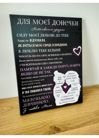 Картина на стену для дочери от мамы с креативным дизайном. Постер на полотне с лакировкой. декор для дома. Можем изменить отдельные слова/фразы, добавить вашу надпись или даже добавить ваше фото в Картину. Материалы: Основание из дерева Полотно из Хлопка Водоотталкивающие чернила Лакирование Крепление на тыльной стороне для фиксации (можно повесить на стену) Высококачественные гипоаллергенные чернила которые не выгорают со временем. (Можно протирать влажной тряпочкой.) Гарантируем отправку на следующий день после подтверждения заказа менеджером (кроме заказов оформленных в субботу, они отправляются в понедельник).