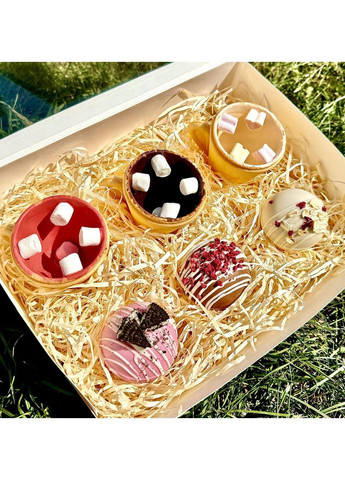 Набор какао-бомбочек и чашек "Универсальный" печенье с какао, маршмелоу и шариками Nesquik (диаметр 5.5см), 280г Какао-бомбочки используют для приготовления горячего шоколада или какао. Сам процесс приготовления дает море эмоций, а сам напиток любят все дети и взрослые. Содержимое набора: 1. Classico+ (Молочный шоколад+ Маршмелоу+ какао Несквик); 2. Oreo (Клубничный шоколад + Какао Несквик + маршмелоу); 3. White (Белый шоколад + капучино + шарики несеквик); 4. Чашка-печенье черная+маршмелоу (Черный шоколад+вафельный стаканчик+маршмелоу) 5.Чашка-печенье белая+маршмелоу(белый шоколад+вафельный стаканчик+маршмелоу); 6. Чашка-печенье розовая + маршмелоу (Клубничный шоколад + вафельный стаканчик + маршмелоу); Состав чашечки: шоколад (масло какао, сахар, сухое цельное молоко, экстракт ванили), натуральный пищевой краситель; Состав бомбочки: шоколад (масло какао, сахар, сухое цельное молоко, соевый лецетин, экстракт ванили), натуральный пищевой краситель; Вес: 280г Важно! Какао бомбочки и чашки печенье является хрупким товаром для компаний доставки, поэтому просим проверять посылку сразу в отделении почтового перевозчика, в случае повреждения – зафиксируйте его с оператором отделения. Спасибо за понимание.