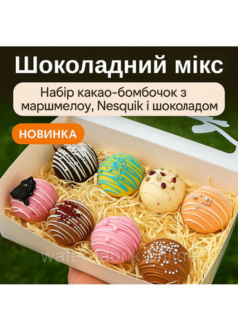 Шоколадные бомбочки "Шоколадный микс" с маршмелом и шариками Несквик 4 шт (диаметр 5,5 см), 266г Какао-бомбочки используют для приготовления горячего шоколада или какао. Сам процесс приготовления дает море эмоций, а сам напиток любят все дети и взрослые. Содержимое набора: 1. Classico (Молочный шоколад+ Маршмелоу+ какао Несквик); 2. Pinky (Клубничный шоколад + Какао Несквик + маршмелоу); 3. Black (Черный шоколад + Какао Несквик + Маршмелоу); 4. Orange (Апельсиновый шоколад + Какао Несквик + Шариковый Несквик); 5. Classico+ (Молочный шоколад+ Маршмелоу+ какао Несквик);6. Oreo (Клубничный шоколад + Какао Несквик + маршмелоу);7. White (Белый шоколад + капучино + шарики несеквик);8. Black (Черный шоколад + капучино + какао Несквик); Состав: шоколад (масло какао, сахар, сухое цельное молоко, соевый лецетин, экстракт ванили), натур. пищевой краситель; Вес: 266г Важно!Какао бомбочки является хрупким товаром для компаний доставки, поэтому просим проверять посылку сразу в отделении почтового перевозчика, в случае повреждения – зафиксируйте его с оператором отделения. Спасибо за понимание.