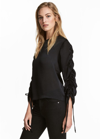 Жатая блузка из слегка просвечивающей ткани. Длинные рукава с кулисками, которые завязываются снизу. Вырез сзади, у горловины пуговица. В изделии возможно повреждение бирки.