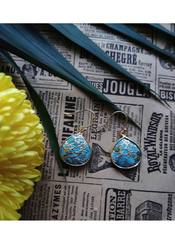 Серьги из натуральной стабилизированной медной бирюзы. Какая редкая новинка! Фурнитура: медный сплав, покрытый золотом. Размер: 41х21мм. P.S. Стабилизированная бирюза – это означает, что камень был пропитан горячими смолами для улучшения цвета и плотности камня. Это мировая практика, поскольку бирюза по своей структуре относительно мягкий и ячеистый минерал, а для ювелирной обработки надо, чтобы камень был более твердым.