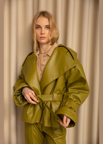 Бомбер утеплен на подкладке. Изготовлен из искусственной кожи premium качества. Модель свободного кроя из гладкой кожи. Рубашечный воротник. Фиксируется по кнопкам. По низу изделия резинка. Два прорезных кармана. Рукава фиксируются резинкой
