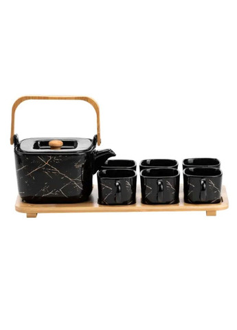 Чайный сервиз на подставке для шести человек - это идеальное сочетание стиля, комфорта и эстетики. Чайник и шесть чашек выполнены в стильном черном мраморном дизайне с золотистыми линиями, что придает им современный вид. Чайник оснащен удобной деревянной ручкой, которая обеспечивает безопасное и комфортное использование во время наливания горячего напитка. Чашки имеют компактную форму и удобно размещаются на бамбуковой подставке, что добавляет набору естественной эстетики. Характеристики: Размер сервиза: 37×17×20 см Объем чашки: 110 мл Объем чайника: 1200 мл Материал подставки: Бамбук Преимущества: Стильный черный мраморный дизайн с золотистыми акцентами подчеркивает современный вид набора. Деревянная ручка чайника обеспечивает удобство и безопасность во время использования. Бамбуковая подставка добавляет набору естественной эстетики и позволяет удобно хранить чашки. Уход: Рекомендуется мыть вручную, используя неабразивные моющие средства и мягкие губки, чтобы сохранить эстетический вид и долговечность сервиза.
