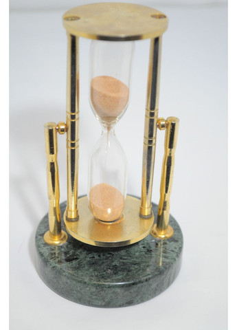 Элегантный практичный подарок песочные часы. Прекрасный элемент декора для рабочего стола. Радует глаз и дает ощущение времени. Прост в применении, всегда готов начать отсчет времени легким движением руки. Винтажные песочные часы сделаны из латуни, что придает вид золота. Основой песочных часов является зеленый змеевик – это минерал, широко применяемый для декора и ювелирных изделий. Основание имеет достаточный вес, чтобы обеспечить устойчивость изделия к поверхности, на которой стоит. Количество песка в часах рассчитано на 3 минуты. Вес 345 грамм. Высота 130 см. Диаметр основания – 75 мм
